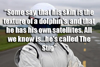 ReplyDeleteHe sounds a bit dangerous. I looked him up and it read "Some say that after he makes love, he eats his partner's head. And that he's recently cut down on his binge drinking, because it's gone up in price. All we know is, he's call The Stig.